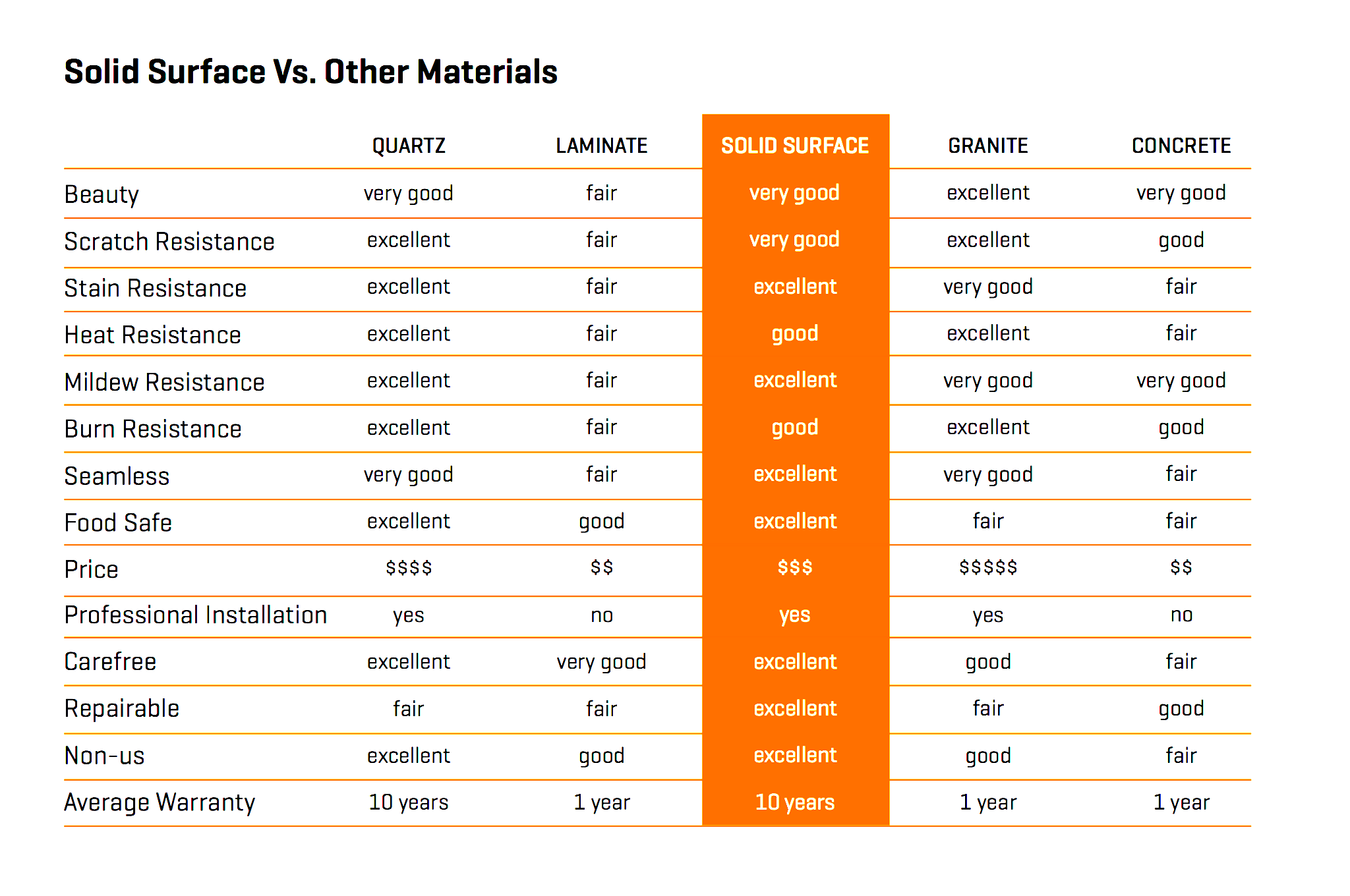 Su combinación exclusiva de resina acrílica y materiales naturales, permite que pueda moldearse para ajustarse a una serie de diseños. Entre las aplicaciones comerciales se incluye cualquier superficie vertical u horizontal en cocinas, baños, aeropuertos, hospitales, instalaciones de preparación de alimentos, establecimientos de venta, escuelas, universidades, estadios, oficinas, stands de exposición y edificios públicos.